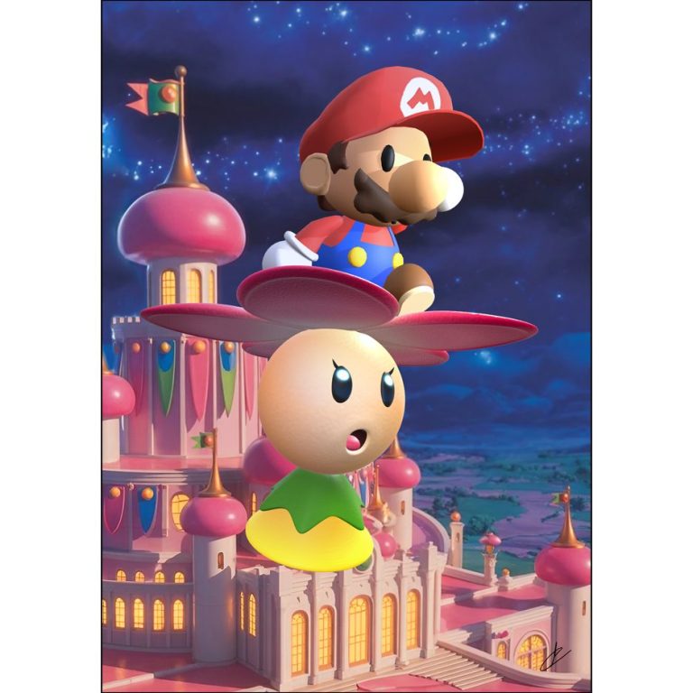 Paper Mario flying from Peach's castle