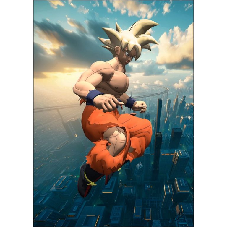 Goku floating above a megacity